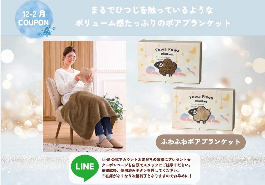 12-2月のLINEクーポンは、ふわふわボアブランケットのプレゼントです🐏