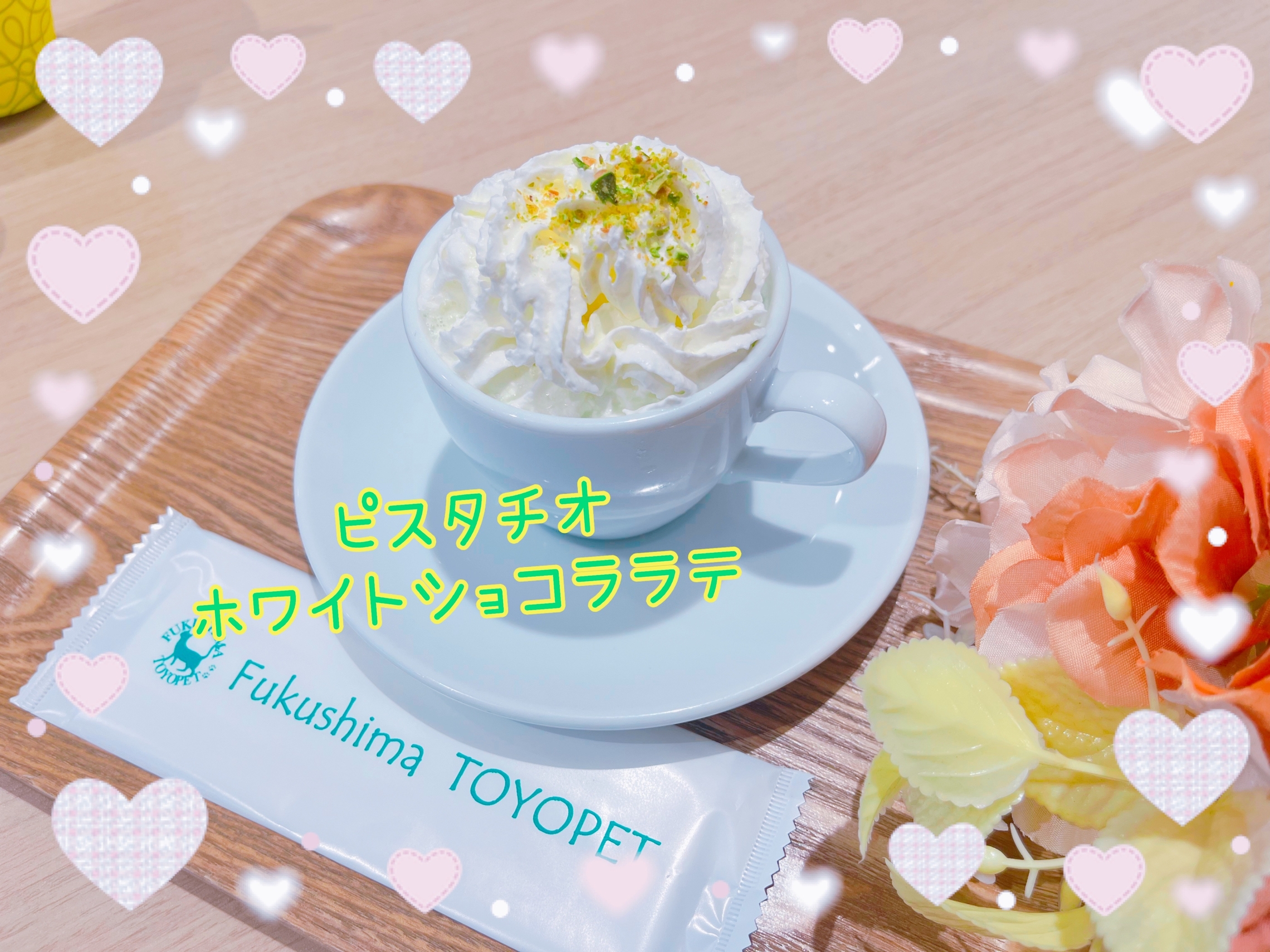 ほんのりピスタチオが香るホワイトショコララテにホイップをトッピング🥤