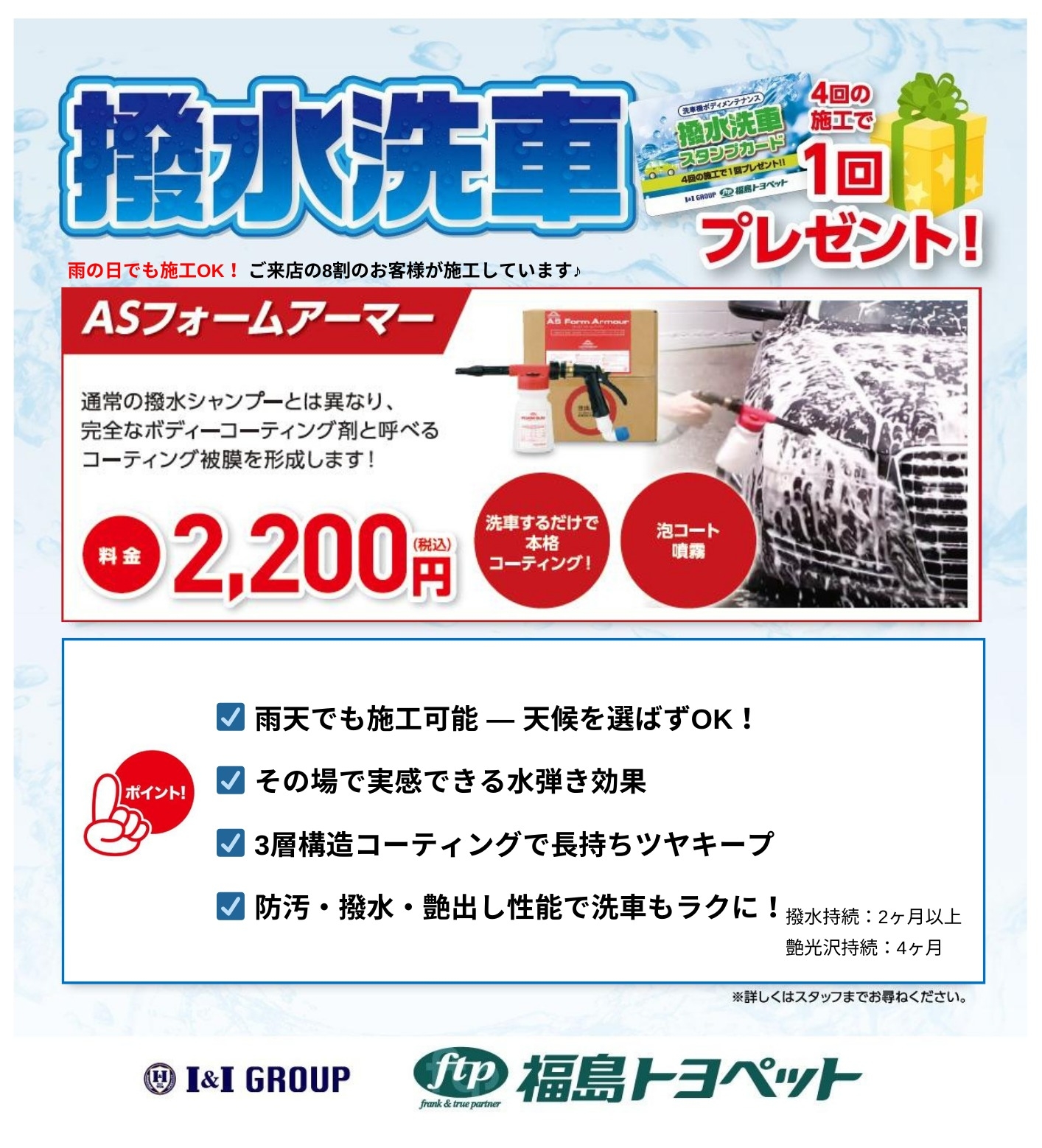 当店では撥水ボディ洗車「ASフォームアーマー」をおすすめしております!撥水効果・ツヤ出し効果・汚れ防止効果があり、ご来店のお客様の8割が施工されています♪ご来店の際はぜひ撥水ボディ洗車を実施ください♪