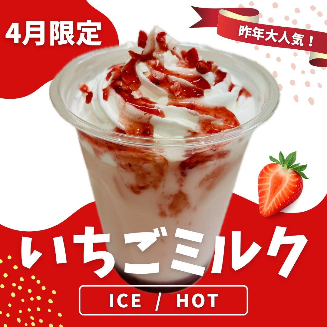 4月の限定ドリンクとして、昨年ご好評をいただいた「いちごミルク🍓」をご用意しております🥰
